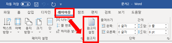 1. 상단메뉴 - 레이아웃 -> 원고지 설정 클릭